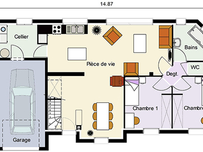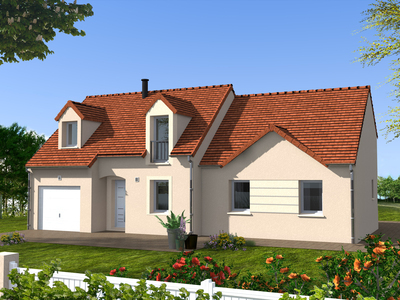 Cette construction d’allure traditionnelle avec ses lucarnes applique aussi les codes de la modernité. Avec des ouvertures plus hautes que larges, et une façade structurée, elle s’organise autour d’une pièce de vie de 42 m² compris ilot central de la cuisine, 2 chambres au RDC et 2 autour de la mezzanine.