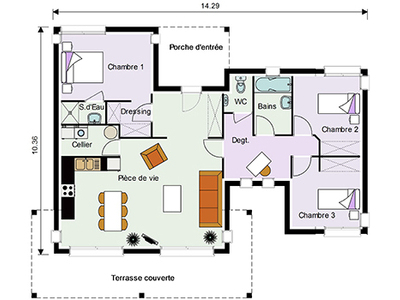 Avec sa forme géométrique et son bardage bois, MAISON DONA a composé ce modèle avec ordre, luxe et volupté. Le préau permet d’accueillir vos amis en toute convivialité, et à l’intérieur une astucieuse distribution avec une pièce de vie de 43 m² et 3 chambres dont une suite parentale.